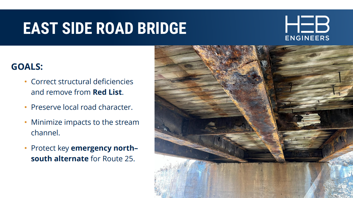 East Side Road Bridge: Through Congressionally Directed Spending and Town funding, the existing bridge will be replaced intending to minimize future flooding and damages to East Side Road. HEB Engineers have been selected to head this project and have developed bridge replacement alternatives as well as conceptual drawings and cost estimates for each. The engineering study is anticipated to be completed in September, 2025.